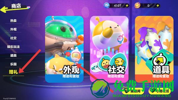 2、进入商城界面后,点击左侧菜单栏中的赠礼选项,选择外观。
