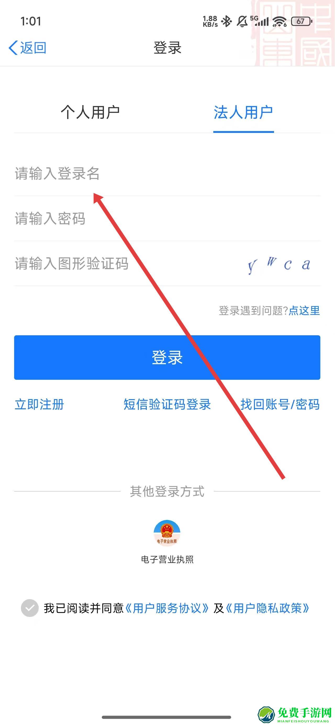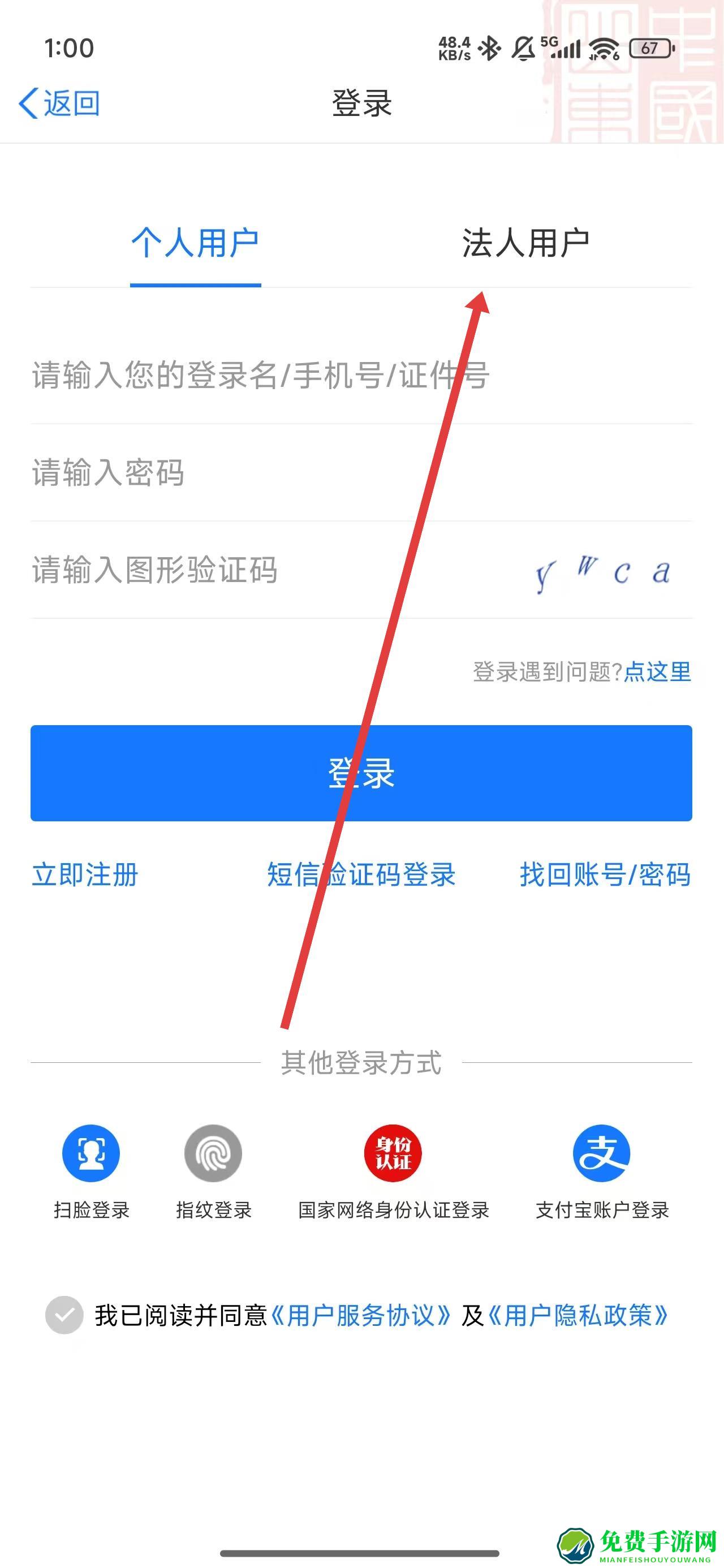2、在登录页面中,可以点击法人用户按钮,切换登录的身份。