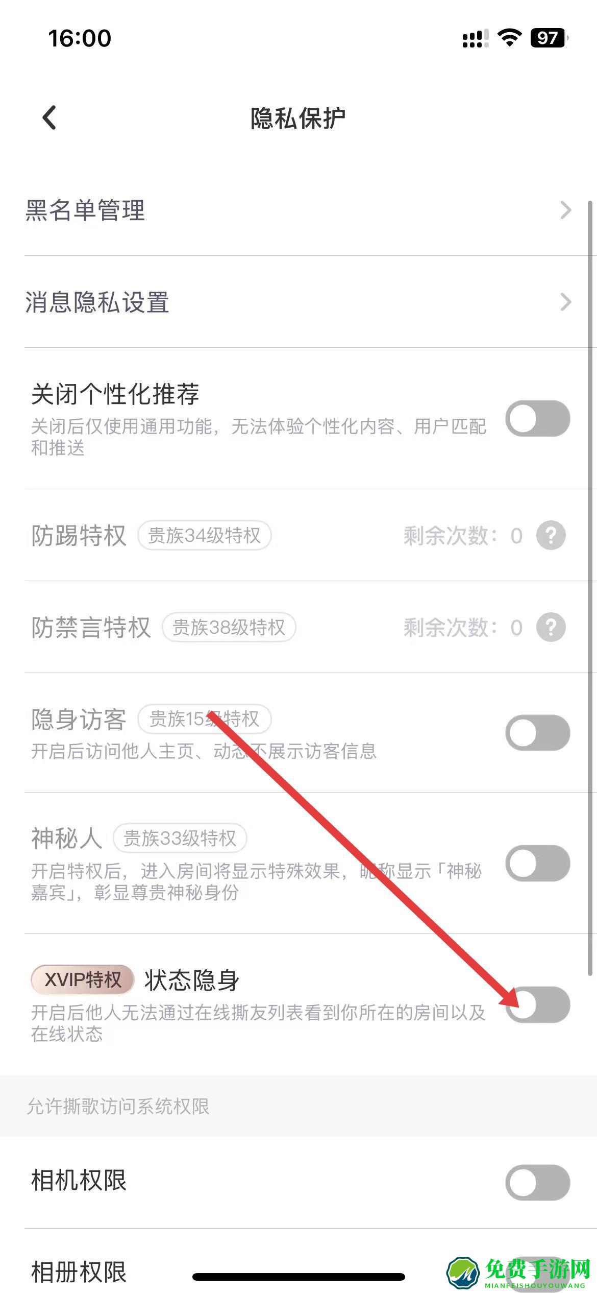 3、在隐私保护页面,找到状态隐身选项,点击其右侧开关按钮,开启后即可隐身。