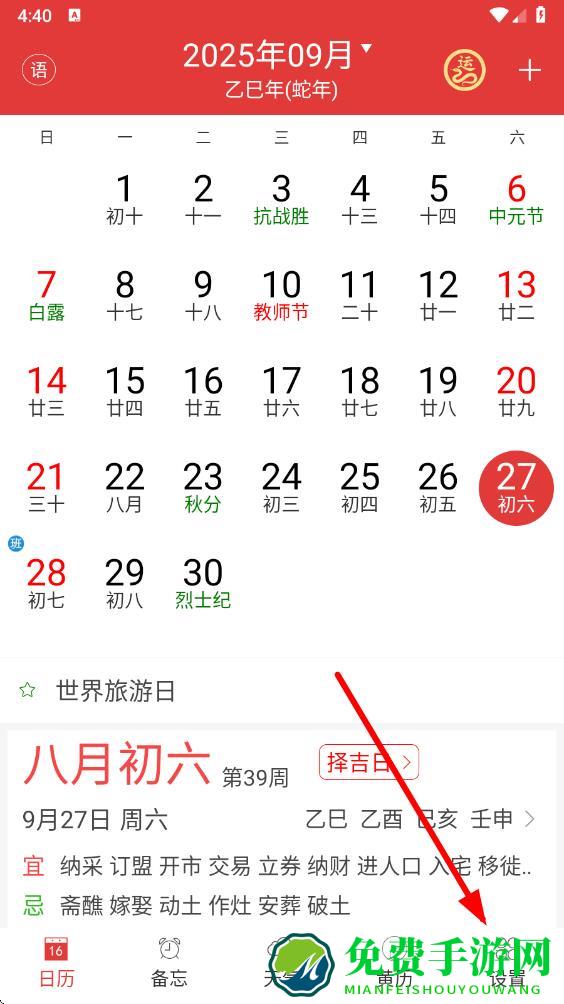 1、打开万年历黄历app,进入主界面,点击底部导航栏最右侧的设置选项。