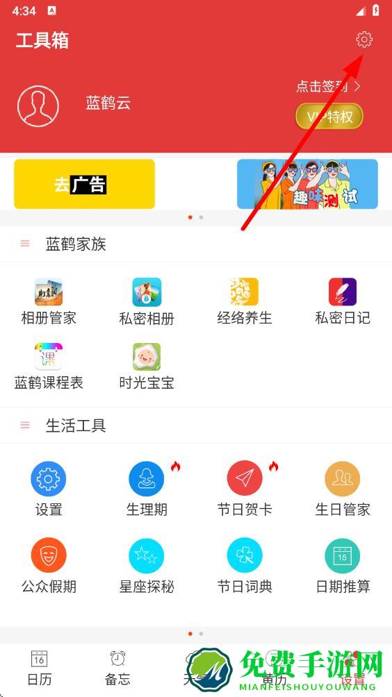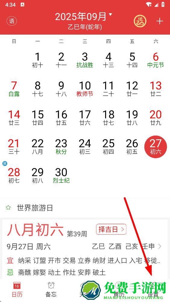 1、打开万年历黄历app,进入日历主界面,点击底部导航栏最右侧的设置选项。