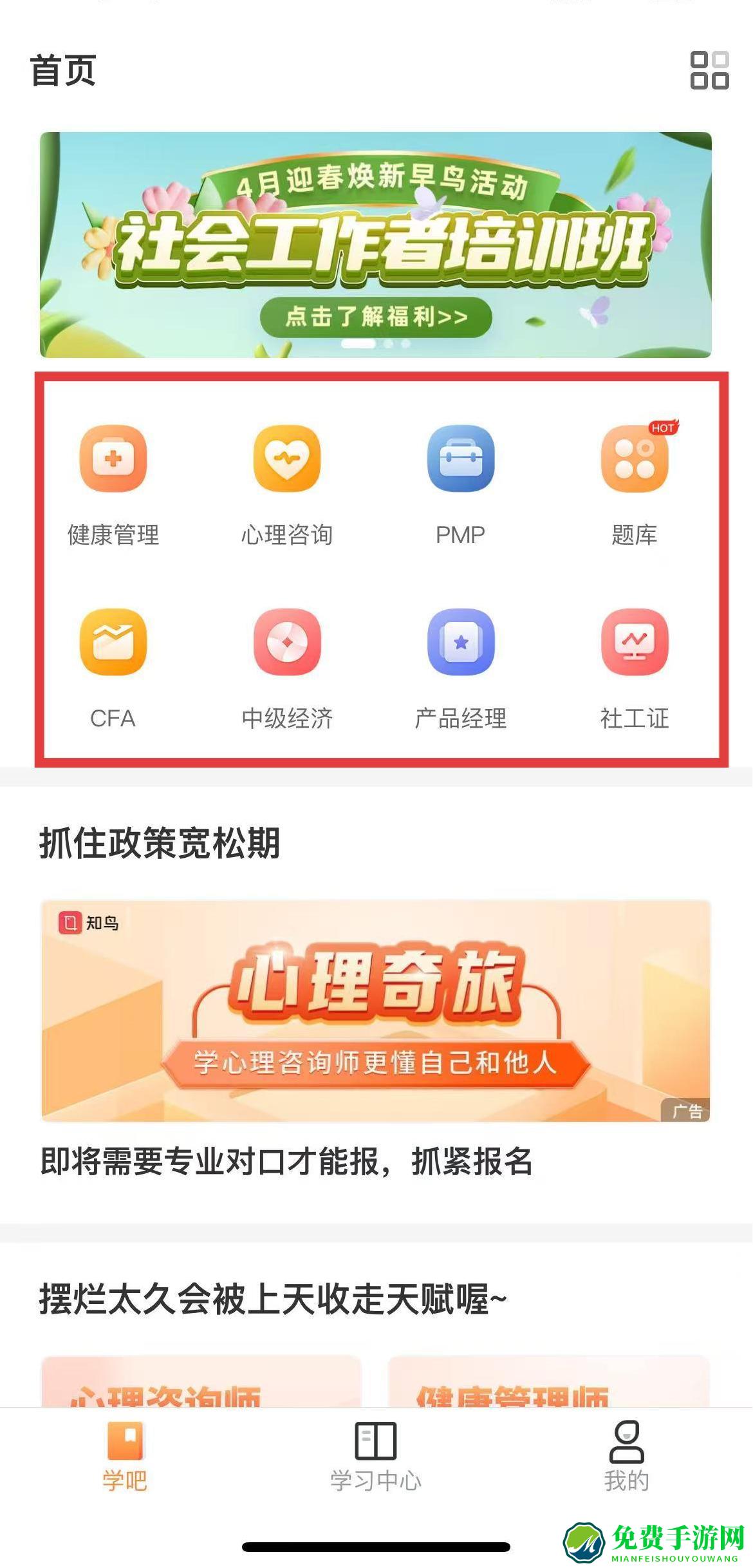 1、点击底部导航栏中的学吧,进入学吧页面,在这里能查看各种各样学习相关的分类。