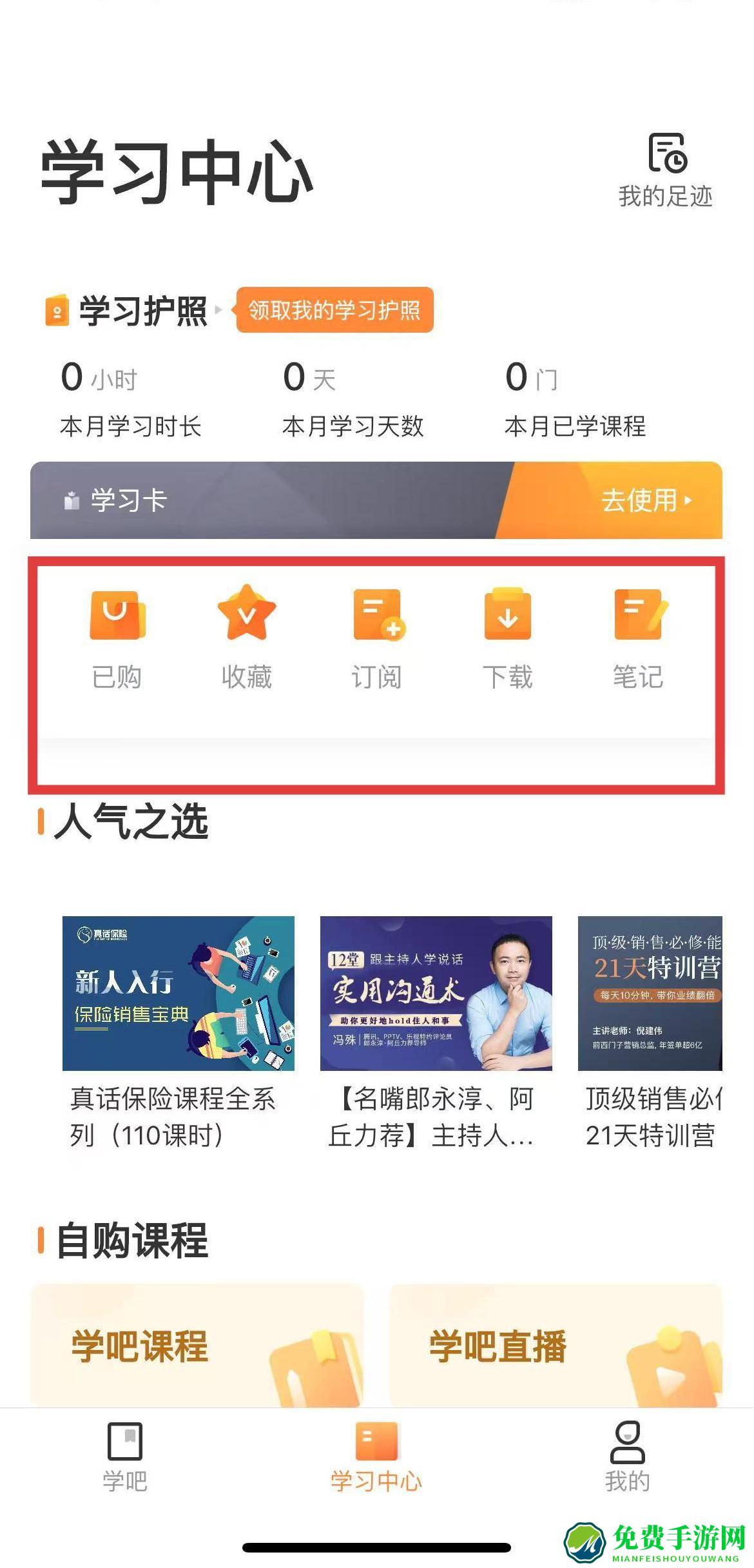 2、在学习中心页面,有已购、收藏、订阅、下载、笔记等功能按钮,功能分明,便于用户使用app功能。