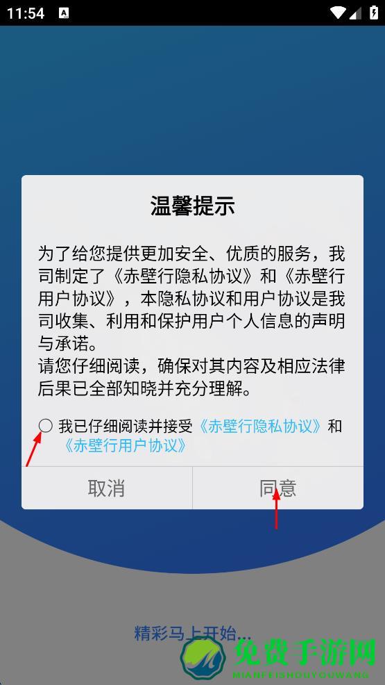 1、打开赤壁行App,出现温馨提示弹窗,勾选已仔细阅读并接受相关协议,点击同意按钮。