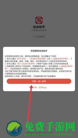 1、打开虫虫助手,阅读隐私协议后点击红色同意按钮,进入应用开启游戏探索之旅。