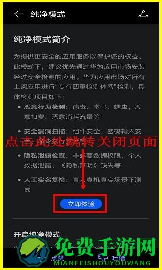 2.此处为纯净模式介绍,点击下方(立即体验)跳转关闭页。