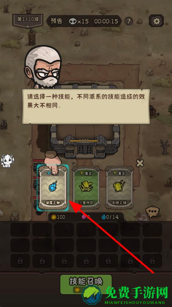 1、首先在技能选择界面,挑选一种技能,不同派系的技能效果大不相同,选好技能后,为后续抵御敌人做好准备。