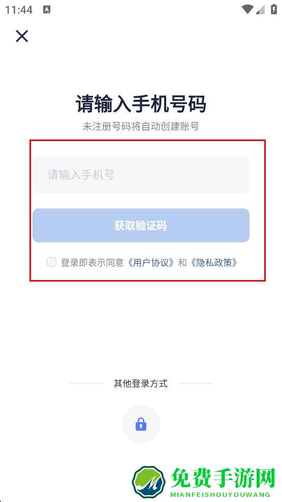 3、在请输入手机号码页面输入手机号,勾选登录即表示同意相关协议,点击获取验证码。