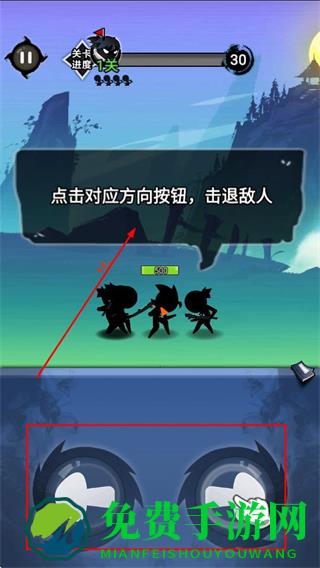 1、进入战斗界面,根据提示点击对应方向按钮,操控火柴人击退敌人,展开功夫对决。
