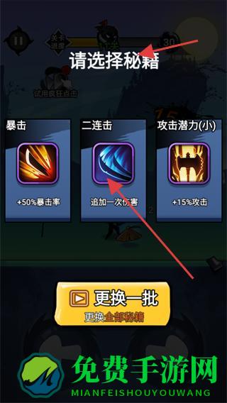 2、通过一关后,会出现秘籍选择界面,可从随机的三个秘籍中挑选,为后续战斗助力。