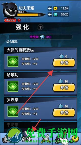 3、进入强化界面,能看到大侠的自我放、蛤蟆功等技能,点击参悟可提升技能的血量、攻击等属性,强化角色战力。