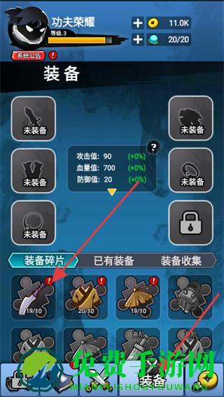 4、在装备界面,可查看装备碎片收集情况,收集足够碎片合成装备,提升角色的攻击、血量、防御等属性,增强整体战斗能力。