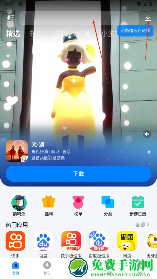 1、打开应用宝,在首页看到喜欢的应用如光·遇,点击下方蓝色下载按钮,即可开始下载该应用,同时也能浏览热门应用推荐。