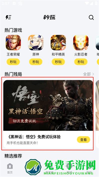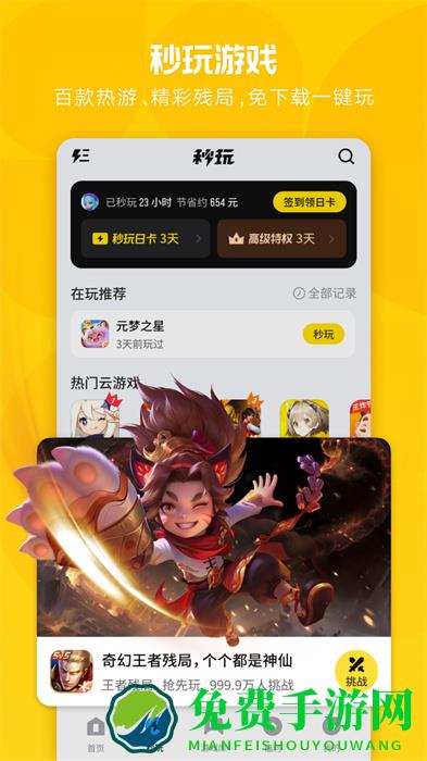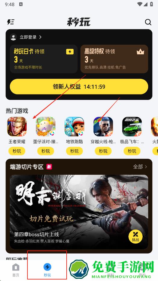2、点击底部秒玩选项,进入秒玩页面,可看到热门游戏如王者荣耀,蛋仔派对等,点击游戏下方秒玩按钮,就能快速体验游戏。