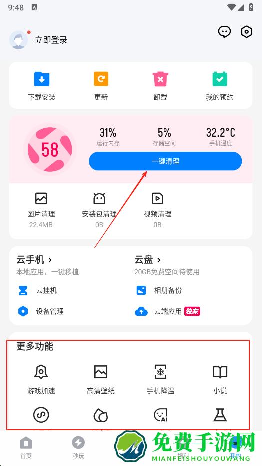 3、点击底部我的选项,进入个人页面,看到一键清理按钮,点击该按钮,可对运行内存、存储空间等进行清理,也能在更多功能里使用游戏加速、手机降温等功能。