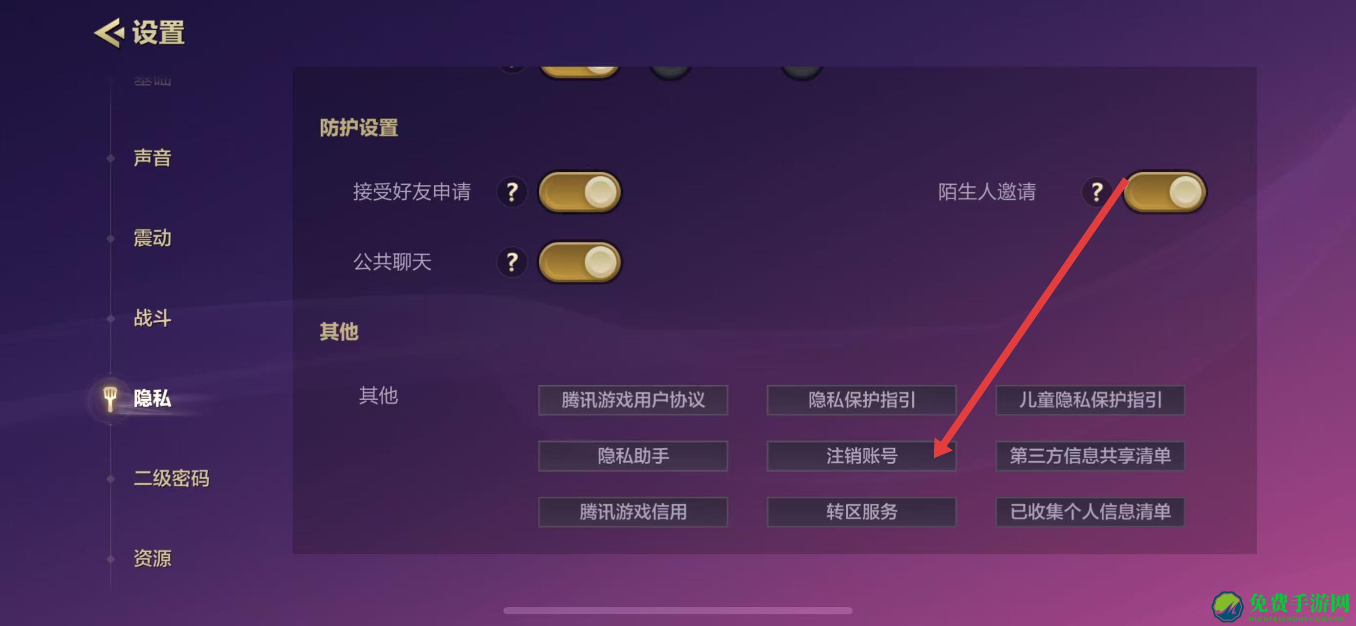 3、在隐私设置界面的下方“其他”板块中,找到注销账号按钮,点击后按照后续提示进行身份验证、确认账号信息等操作,即可完成游戏账号注销。