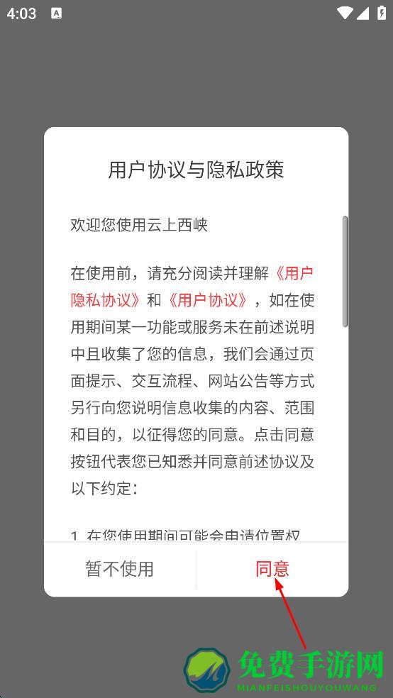 1、打开云上西峡App,出现用户协议与隐私政策弹窗,阅读后点击同意按钮。