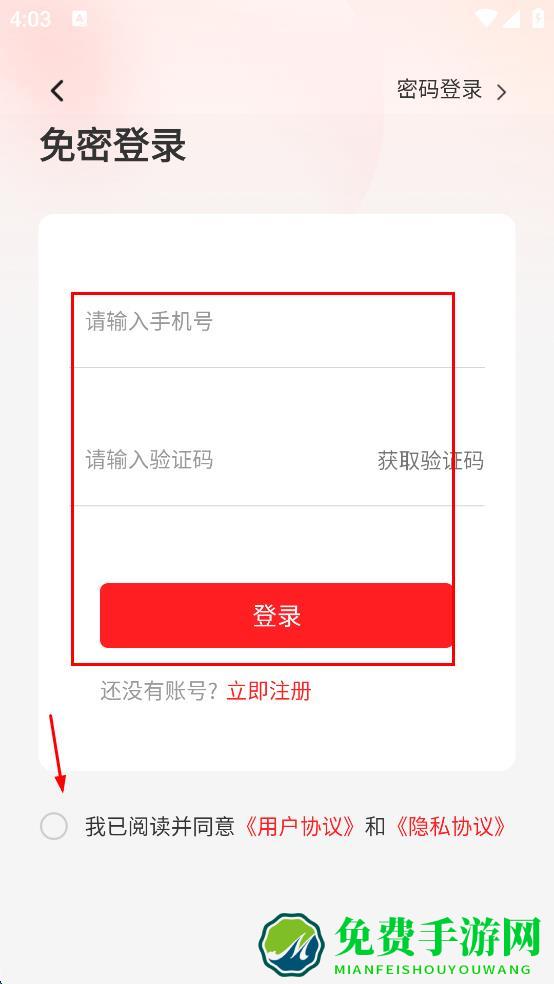 4、在免密登录页面勾选已阅读并同意相关协议,输入手机号和验证码,点击登录按钮完成登录。