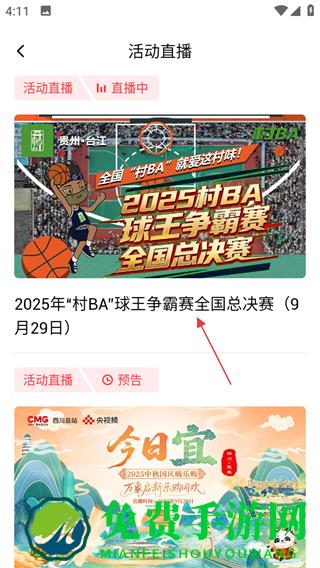 2、在活动直播页面,选择2025年村BA球王争霸赛全国总决赛直播。