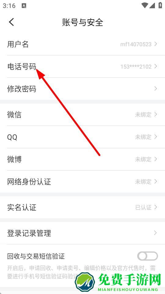 3、在账号与安全页面里,点击电话号码选项准备更换。