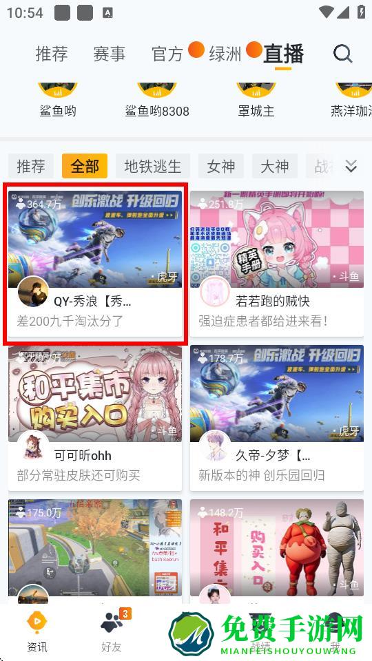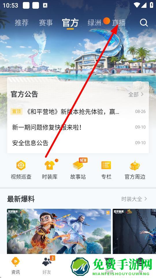 1、打开和平营地APP,点击上方导航栏中的直播选项进入直播页面。