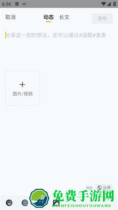 3、在动态发布界面,就可以看到文案的输入页面,还有图片和视频内容都可以添加,然后我们就可以输入想要发布的动态;