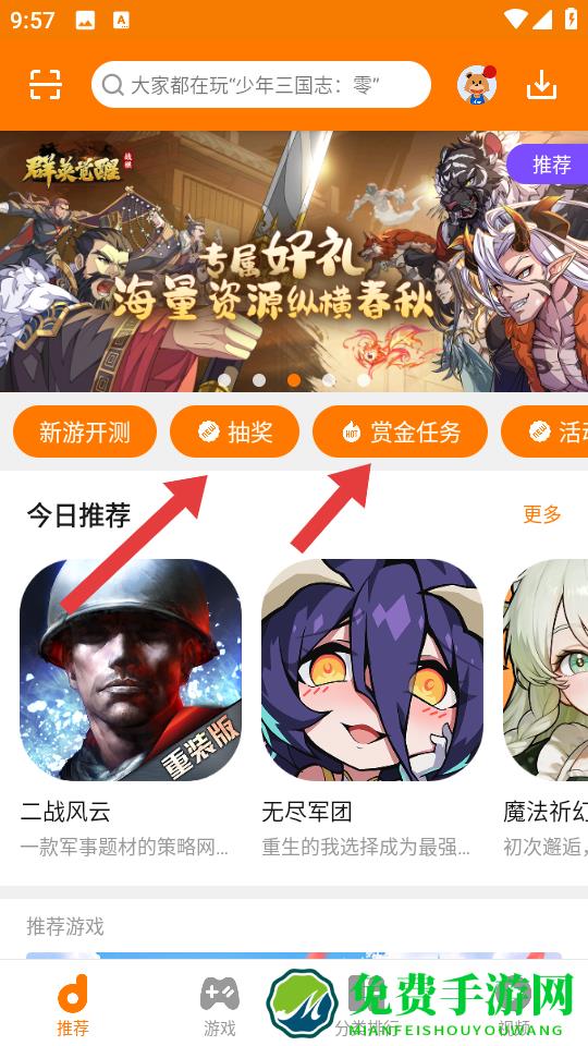 1、打开当乐APP进入推荐页面,我们可以选择点击抽奖或者赏金任务的按钮,进入活动的界面。