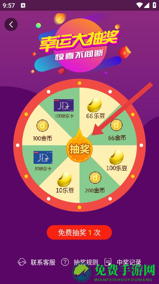 2、在抽奖活动界面中,点击抽奖,有机会获得乐豆奖励,还可点击免费抽奖1次,参与免费抽奖获取乐豆。