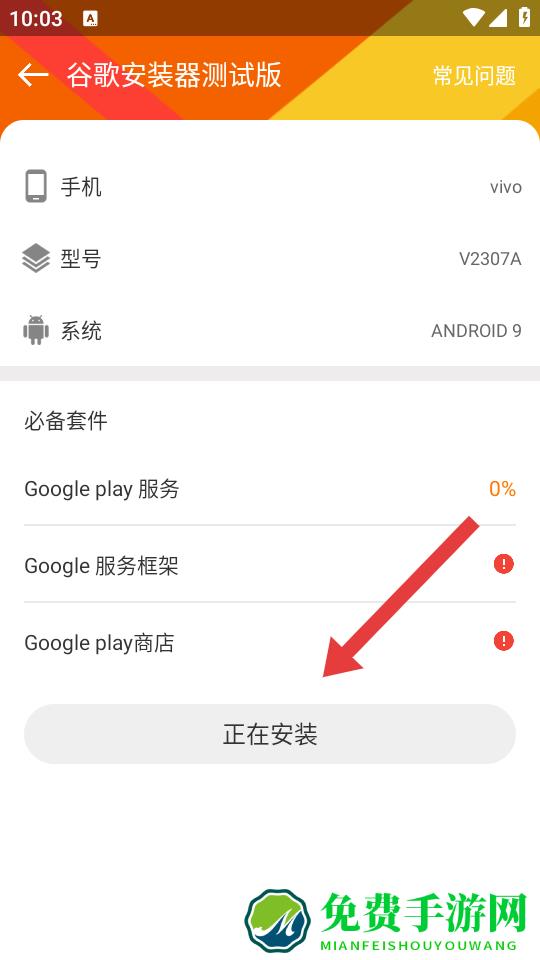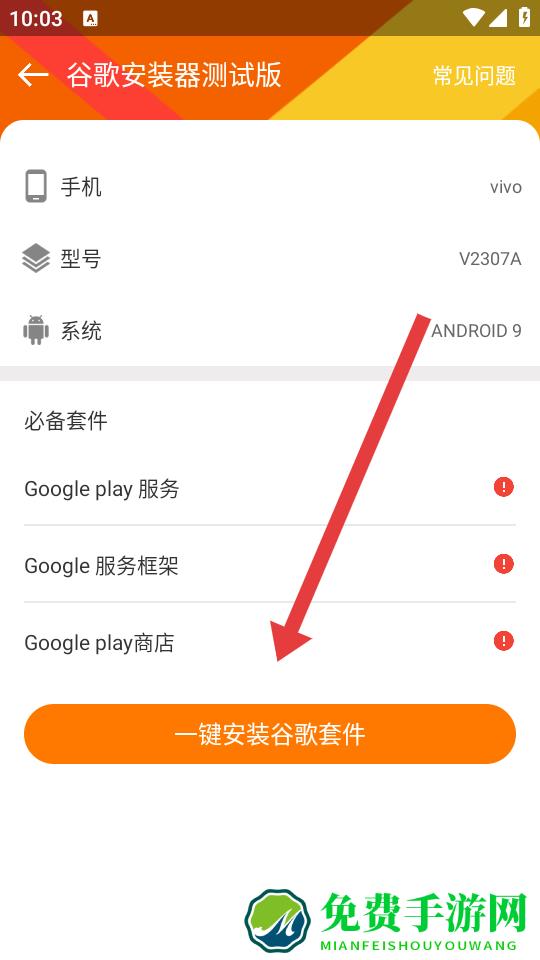 2、在谷歌安装器测试版页面,确认手机、型号、系统等信息后,点击一键安装谷歌套件的按钮。