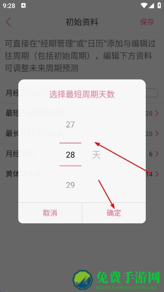 3、进入初始资料页面后,点击最短月经周期天数编辑项。