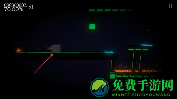 1、进入游戏,操控方块在平台上移动,屏幕左上角显示分数和倍数,如0000000007x1,70.00%可能是通关进度。
