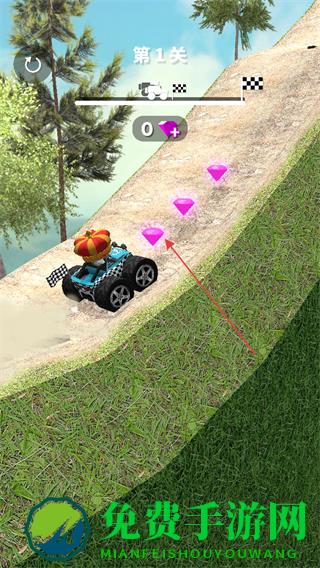 1、进入第1关,点击屏幕操控按钮,驾驶赛车在越野赛道上前进。