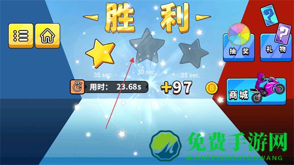 4、到达终点后,依据用时获得星级评价,可点击界面继续挑战新关卡。