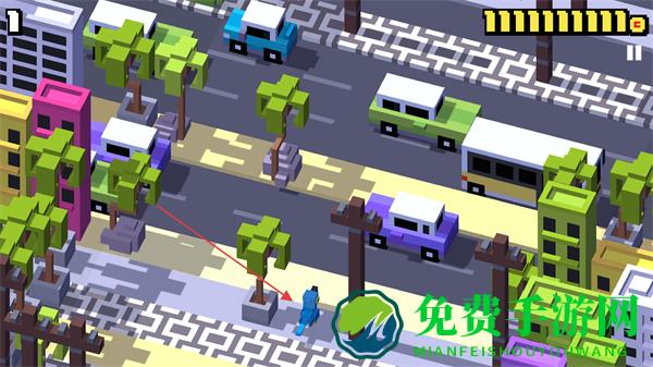 场景中不设置斑马线与红绿灯,仅靠车流自然形成通行难度,突出冒险横穿的特点,增强玩法的紧张感。