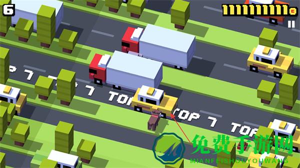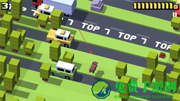 2、成功穿过马路后,继续操控角色前进,留意道路上出现的TOP7等标识,同时注意来往车辆。