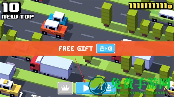 4、达到一定分数如10分,出现FREEGIFT提示时,点击下方播放按钮图标,可选择获取奖励或继续游戏。