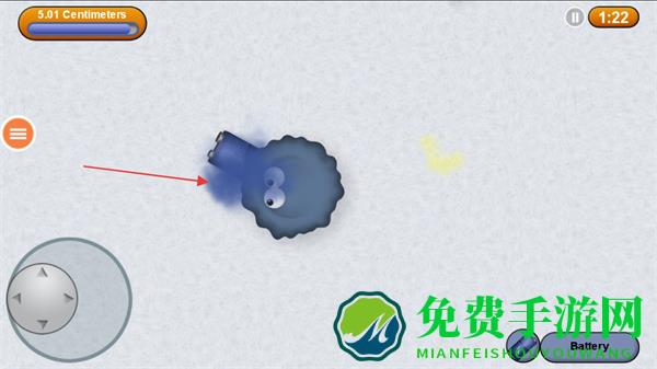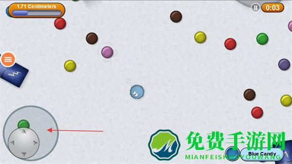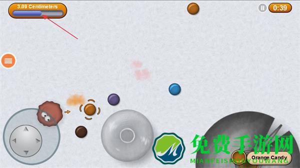 1、使用左下角虚拟摇杆操控蓝色小球移动,收集彩色糖果,留意上方进度条1.71Centimeters。
