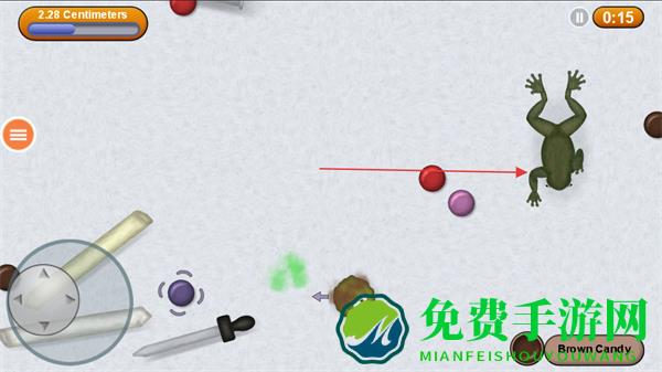 2、随着小球变大,可吞噬青蛙等小型物体,注意右上角时间0:15,快速积累体积。