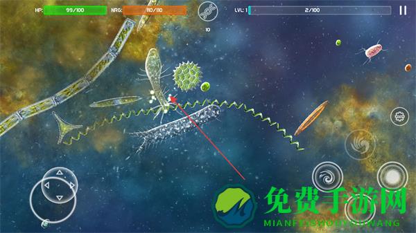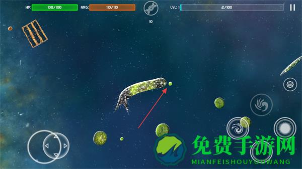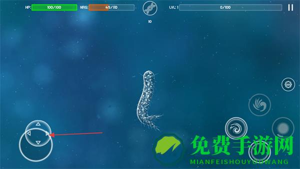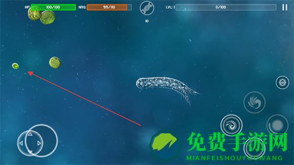 1、进入游戏界面,通过左下角虚拟按键操控微生物移动,留意上方HP生命值和ENER能量值。