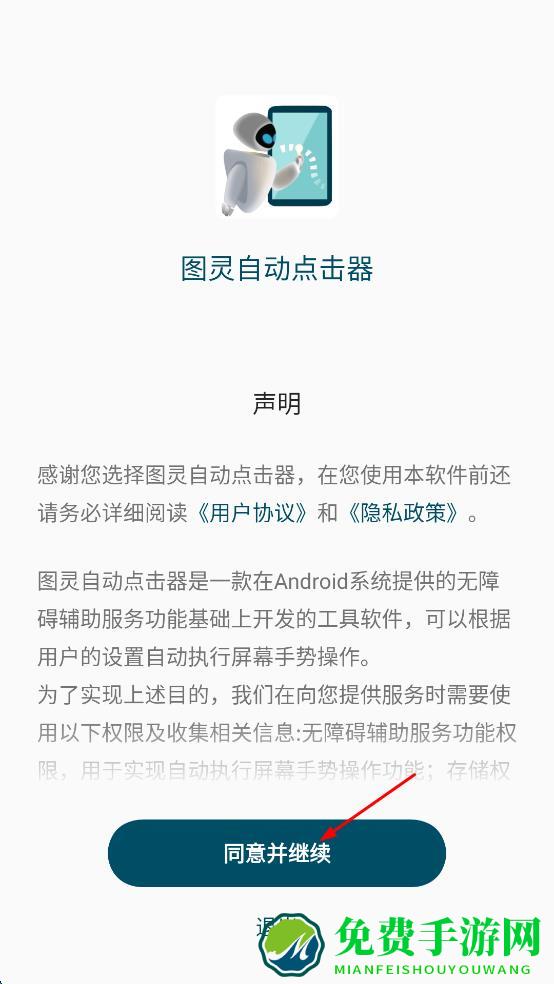 1、打开图灵自动点击器,在声明页面点击“同意并继续”,进入图灵自动点击器主界面。