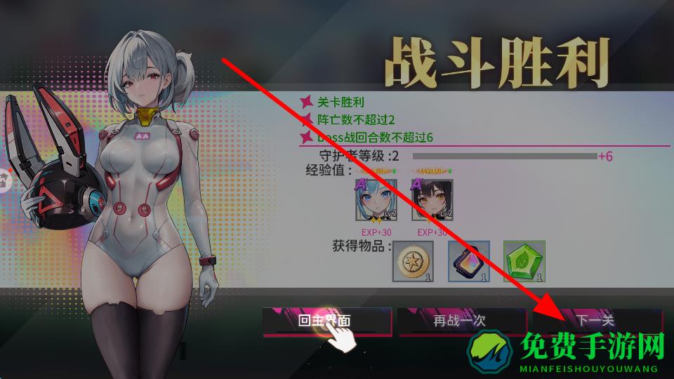 4、关卡胜利后,根据需求选择回主界面、再战一次或下一关,点击下一关,就能继续挑战新的关卡。
