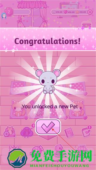 4、成功解锁新宠物后,出现Congratulations!提示,点击对勾图标确认。
