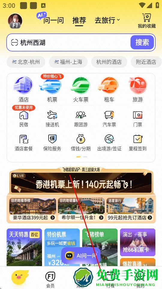 1、打开飞猪旅行APP,点击底部导航栏中的行程选项。