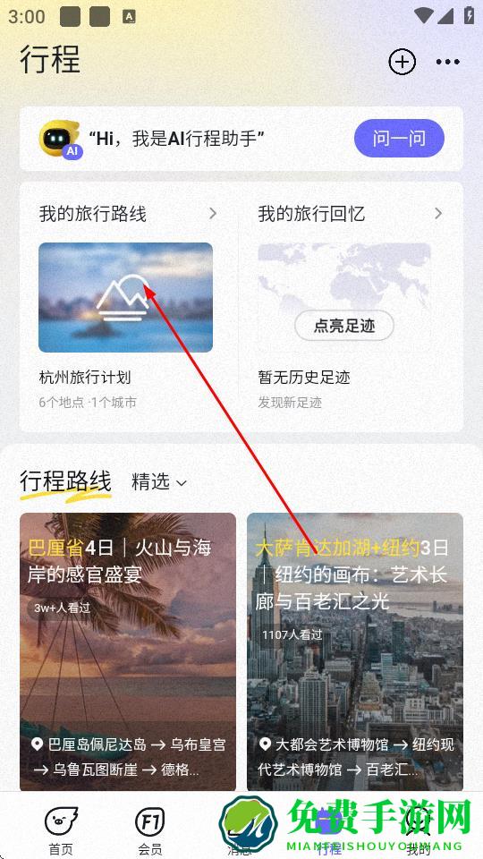 2、在行程页面中,点击我的旅行路线。