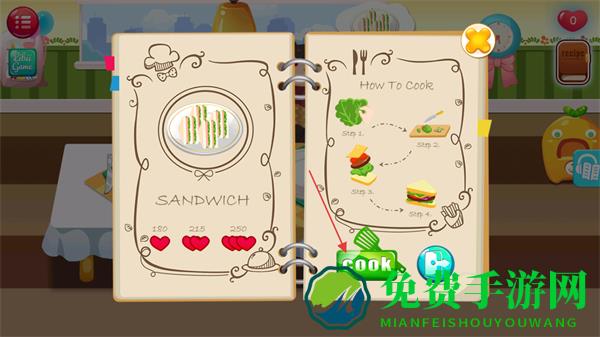 2、查看菜谱,了解制作SANDWICH的步骤后点击COOK按钮开始制作。