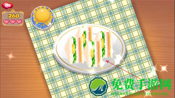 4、完成切割,做出摆盘好看的三明治,获取分数如260,上菜给顾客。