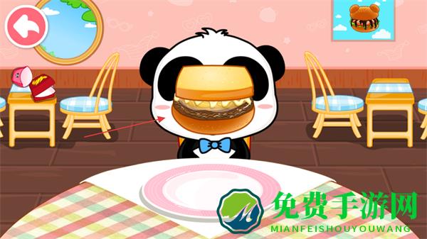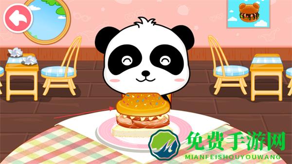 4、将制作好的汉堡呈现给熊猫角色,让它享用,完成一次美食制作任务。