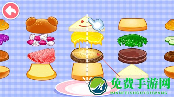 2、切换到食材选择界面,从众多食材中挑选心仪的食材,比如芝士、肉饼等,点击食材拖放到盘子上进行组合。