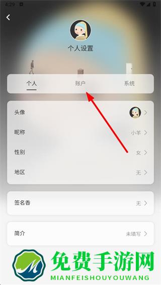 3、在个人设置页面,点击账户选项,切换到账户设置界面。