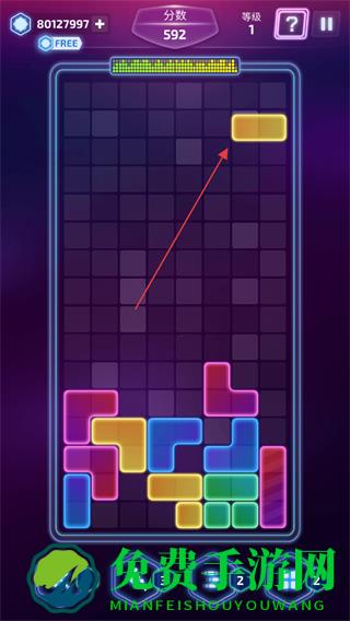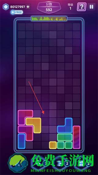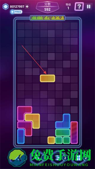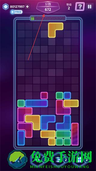 1、进入游戏,查看屏幕上方的分数,等级,观察掉落的彩色方块,选择合适位置放置。